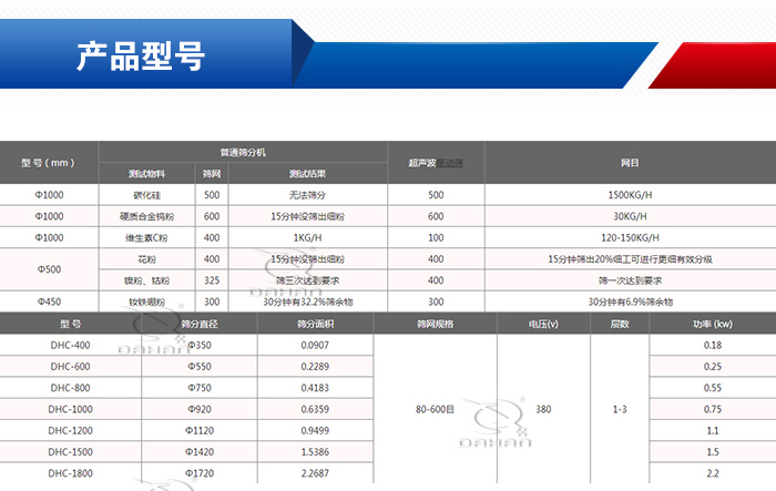 超聲波振動篩的常規(guī)型號有DHC-400、DHC-600、DHC-800、DHC-1000、DHC-1200、DHC-1500、DHC-1800、DHC-2000等,同時大漢機械支持產(chǎn)品特殊定做,根據(jù)您的要求為您定制出合適的設(shè)備!
